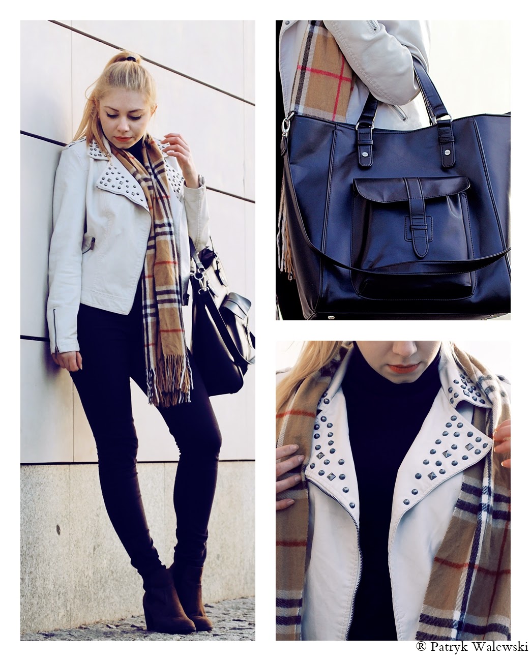 Ostatnio na fanpagu pokazywałam kremową ramoneskę z scond handu za 12 zł. Oto ona! Uchowała się jako jedyna perełka w pomieszczeniu z przecenami na wagę. Poza tym mam na sobie swetrowy golf bez rękawów za 1 zł oraz kraciasty szalik, również z lumpeksu. Torebkę upolowałam na przecenie