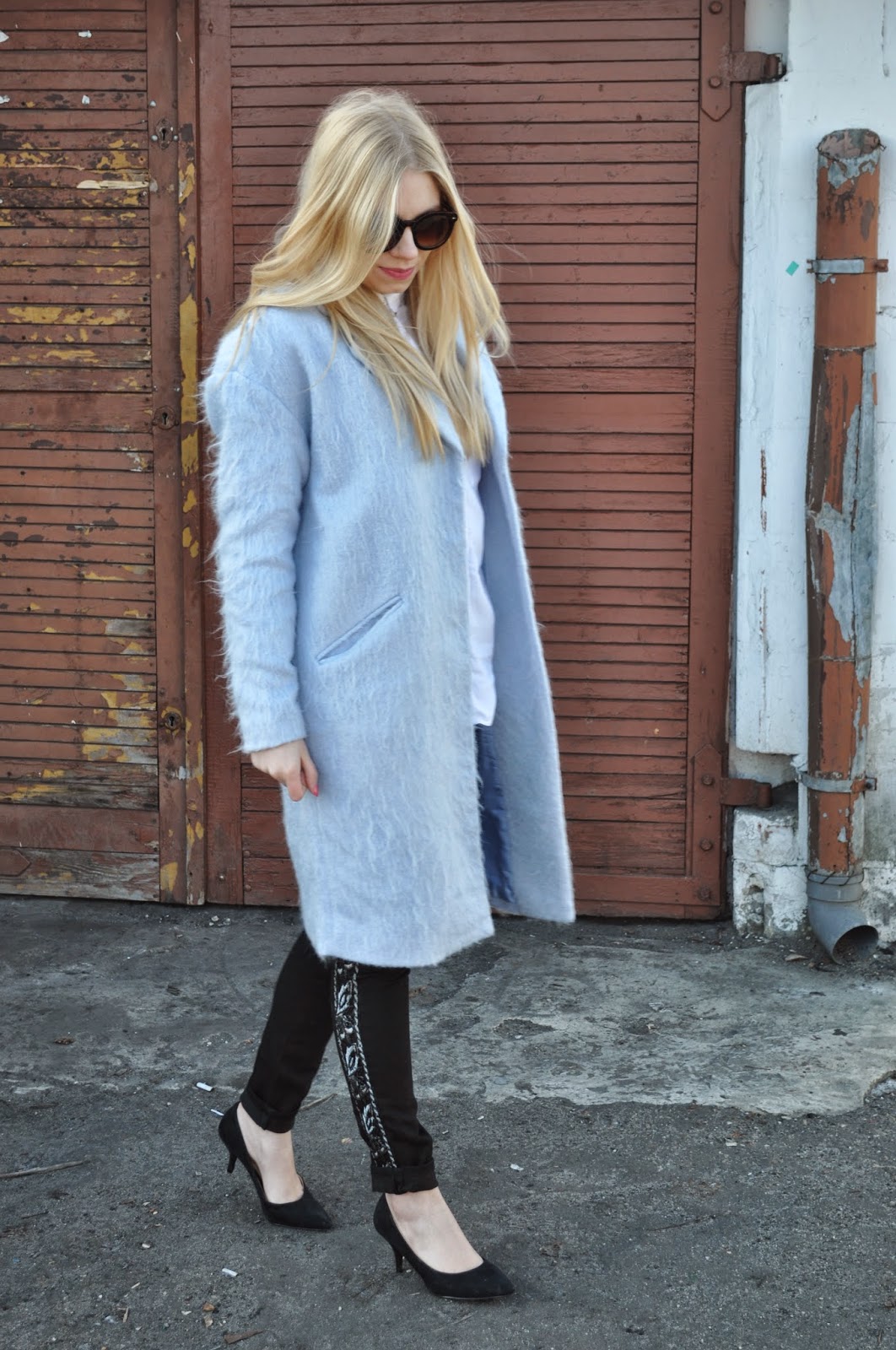 Wykonany jest z 45% akrylu, 26% wełny, 16% moheru i 13 % nylonu. Chociaż jest bardzo cienki, jest tak samo ciepły jak moja zimowa kurtka. A może nawet bardziej? Jedynym jego minusem jest to, że bardzo opyla ciemne rzeczy, co widać na moich spodniach. Jeśli szukacie płaszcza, lećcie do sklepu, bo warto!