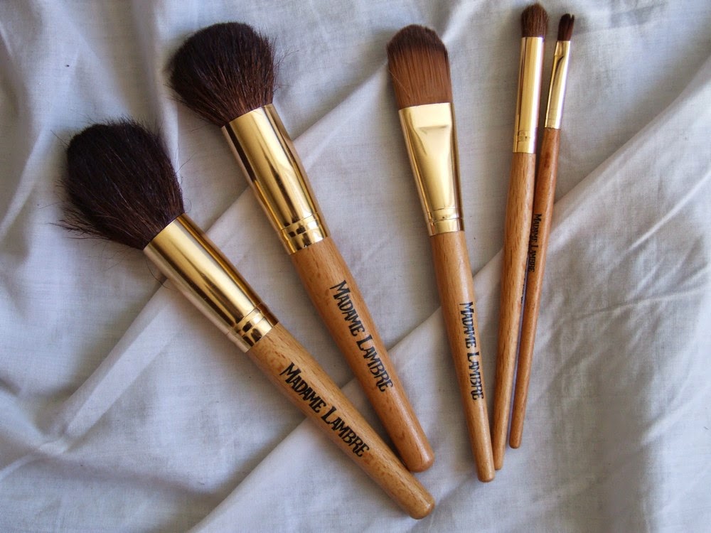Jakiś czas temu w moje ręce trafił zestaw pędzli do makijażu firmy Madame L'ambre. Marka ta jest stosunkowo świeża na polskim rynku, a ich produkty można dostać na stronie internetowej lambre.eu. Standardowa cena kompletu pędzli to 47 zł, ale ja kupiłam je na allegro za 20 zł. Pędzle wykonane są w większości z naturalnego włosia, więc nawet 47 zł to zadziwiająco mało jak na 5 sztuk. Pomyślałam, że zobaczę jak się ma opis do jakości.