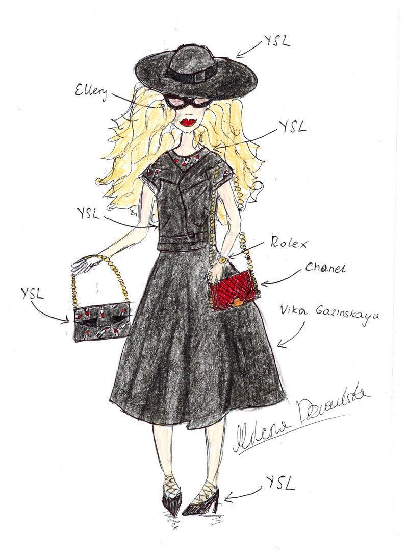 Każdą stylizacje trzeba uzupełnić dodatkami. Wiązane szpilki świetnie pasują do rockowego klimatu  mojego outfitu. I dwie torebki! A kto bogatemu zabroni?  Bez Chanelki się nie obędzie. To największa klasyka wśród torebek, każda szanująca się milionerka musi mieć ją w swojej szafie. Wybrałam czerwoną- to kolor ponad kolorem. Nie dość, że kojarzy się z luksusem to świetnie ożywia moją stylizacje. Druga torebka to model od YSL. Jak widać, pochodzi z tej samej kolekcji co T-shirt. Sama torebka połączona z bluzką wyglądałaby zbyt pstrokato. Razem z czerwoną Chanelką tworzy zaś idealną parę. Aby dopełnić stylizację wybrałam czarny kapelusz. Uwielbiam kapelusze,  zawsze dodają szyku. Kocie okulary odkąd pamiętam kojarzą mi się z blaskiem reflektorów. Dziś pierwszy raz w życiu stać mnie na okulary, które naprawdę chronią oczy. Na rękę, zamiast bransoletki wybrałam ponadczasowy Rolex. Marka wszech czasów, te zegarki zawsze były i będą cenione. Wisienką na torcie całej stylizacji są czerwone usta. Tak dużo tu czerwonych szminek, więc na ustach też MUSI być. Bez niej brakowałoby "tego czegoś".