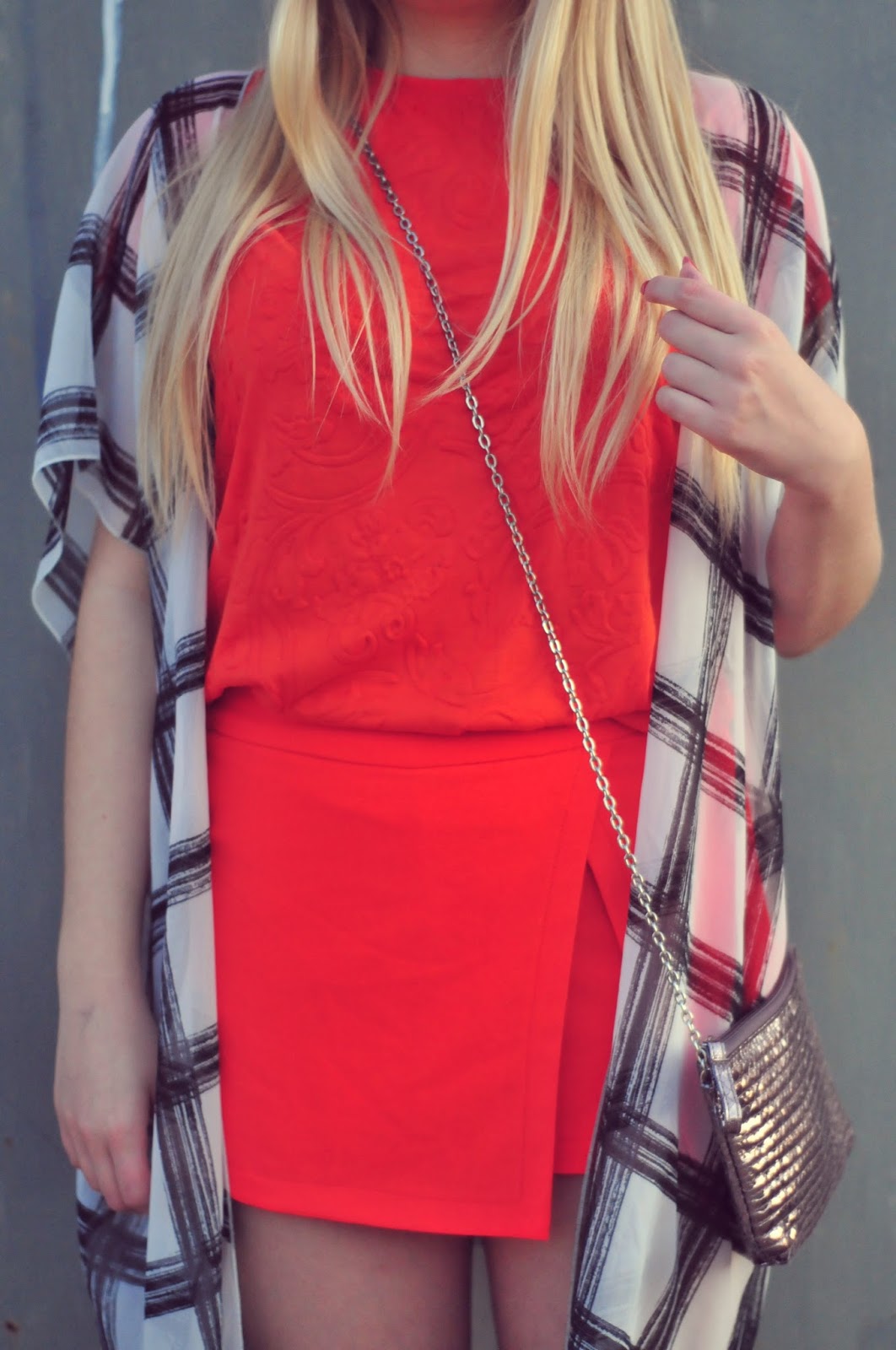 W dzisiejszym rzucie mam na sobie pomarańczowy komplet. Spodenki kupione na wagę za jakieś 1,30 zł. Miały popsuty suwak, a za naprawę zapłaciłam 3 zł. Opłacało się. Do tego koszulka w tym samym kolorze, również wygrzebana za niecałe 2 zł. Żeby nie było tak przewidywalnie, zarzuciłam na siebie kimono, które kupiłam w wakacje 2014. Chętnych na nie zbyt wielu nie było, bo trochę ich na wieszakach wisiało. Mimo że kosztowało 10 zł!