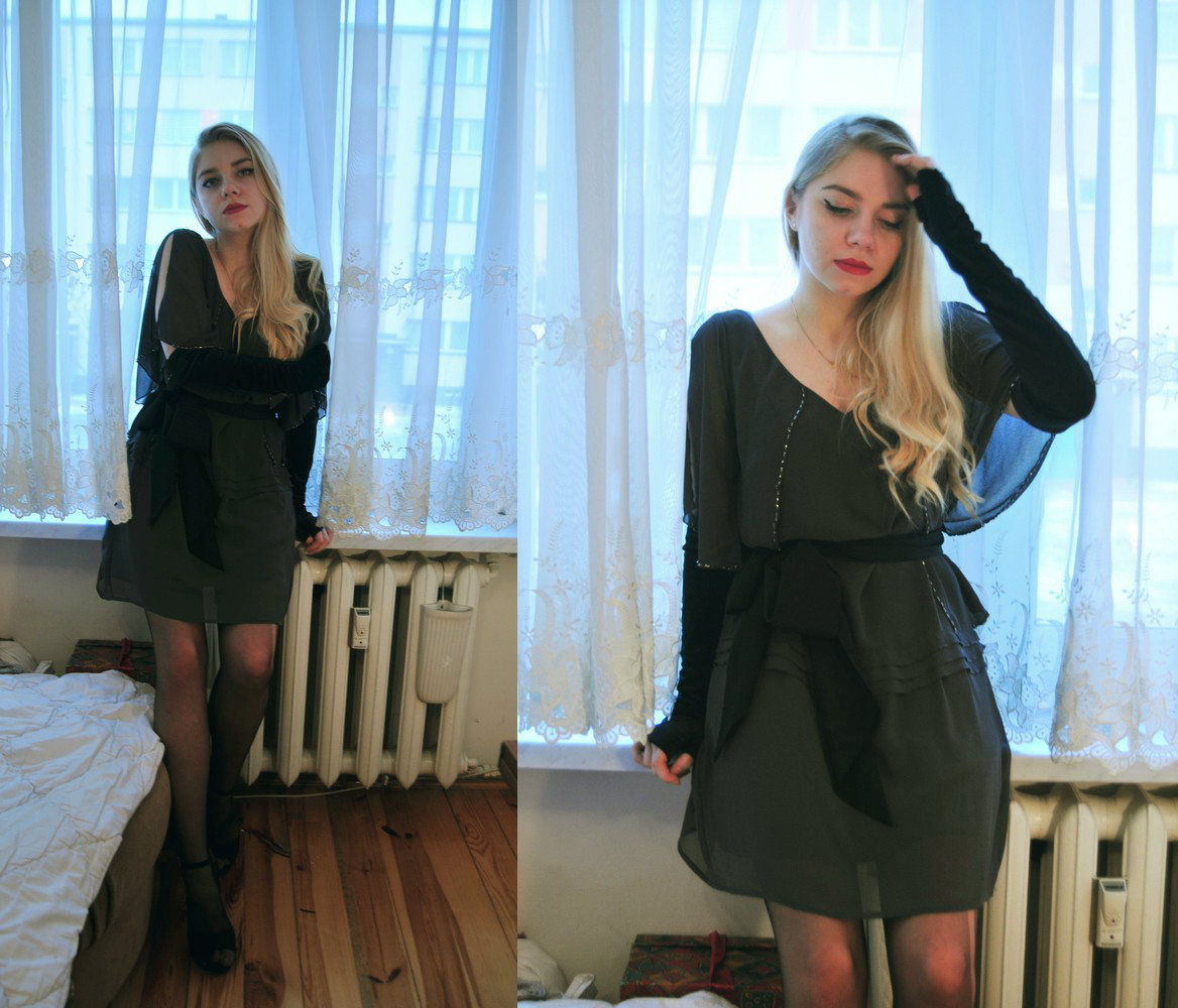 Przechodząc do sedna- czyli stylizacji, dzisiaj karnawałowa propozycja, delikatnie w stylu lat 20. Śliczna sukienka z Ciucholandii jest w sumie typową kreacją przypominającą tamten okres, ale ja trochę ją uwspółcześniłam, związując w talii apaszką. Welurowe rękawiczki wyszperałam jakoś ostatnio za złotówkę - 'a może się do czegoś przydadzą' - pomyślałam, no i przydały. :)