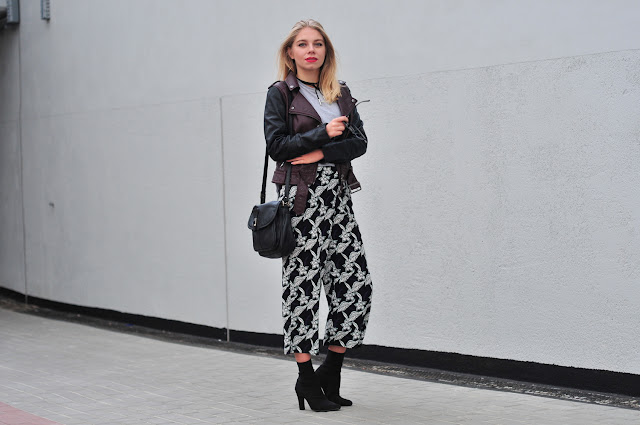 Od jakiegoś czasu miałam ochotę na inne spodnie niż jeansy.  Coś mi zaświtało, że moja szafa potrzebuje urozmaicenia. Długo nie mogłam znaleźć nic oryginalnego, co przypadłoby mi do gustu. Chciałam mieć takie spodnie, których nie będę nosiła codziennie. Które założę, kiedy przyjdzie mi chęć 'zaszaleć' w kwestii stroju. Z pomocą przyszła mi Ciucholandia, czyli internetowy lumpeks, z którego rzeczy już niejednokrotnie pokazywałam. Padło na kwieciste kuloty z Topshopu, które kosztowały zaledwie kilka złotych. Taka wyrazista część garderoby, potrzebuje stonowanych dodatków. Mój wybór, to prosty męski T-shit, aby nie było zbyt elegancko i rockowa ramoneska. Do tego obcisłe botki i stylizacja na wczesną jesień gotowa.