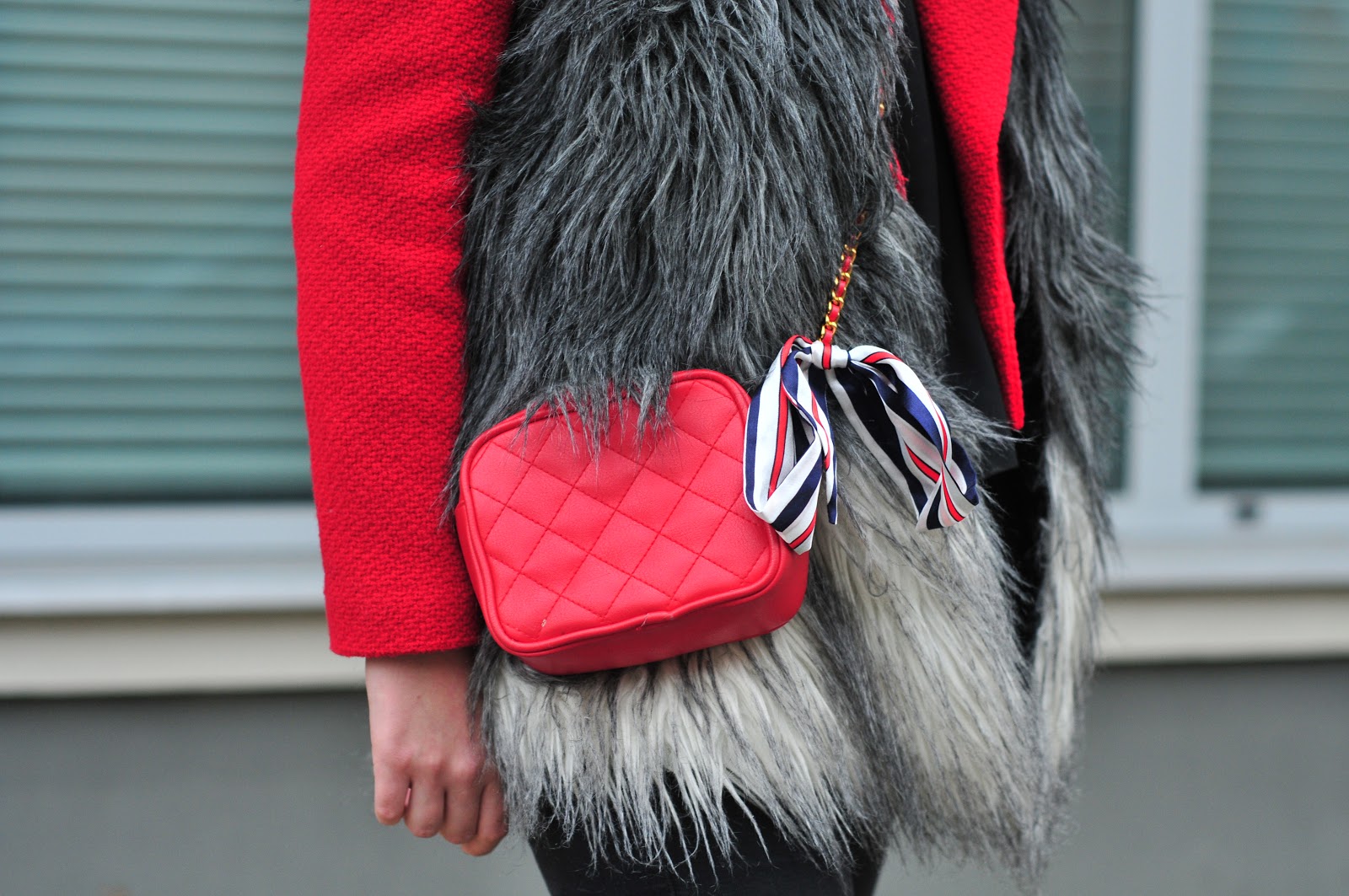 Czerwień doskonale wpisuje się w jesienną aurę. Podbija kolor liści, a przy okazji rozwesela ulice, na których, jak co roku pojawia się coraz więcej szarości. Mój czerwony płaszczyk (wygląda może na marynarkę, ale ma podszewkę i materiał typowy dla okrycia wierzchniego) to wakacyjny łup z lumpeksu. Kosztował mnie całe 5 zł! Zimniejsze dni przyszły bardzo szybko, więc przy noszeniu go musi pomagać mi ciepła futrzana kamizelka. Co sądzicie o takim połączeniu? Stawiacie na czernie i szarości, czy lubicie czasem zaszaleć? :)