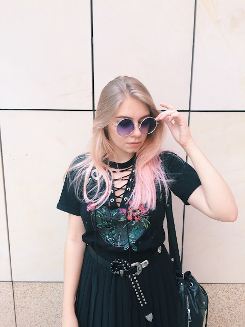 Plisowana spódnica midi -  często uważana za babciną - dziś stała się  uniwersalnym ubraniem. W zeszłe wakacje ta sama układanka towarzyszyła mi przy bardziej sportowej stylizacji - z beżowymi sneakersami do kostki i kwiecistym topem - pamiętacie? Jeśli nie, odsyłam TUTAJ. Dziś przyszła pora na coś  w nieco rockowym stylu. Sznurowane buty i modny wiązany T-shirt tworzą z nią świetne kombo. Taka stylizacja sprawdzi się również na jesień. Wystarczy założyć czarne rajstopy i skórzaną kurtkę, a chłodniejsze dni nie będą nam straszne.