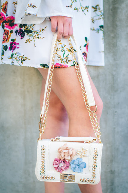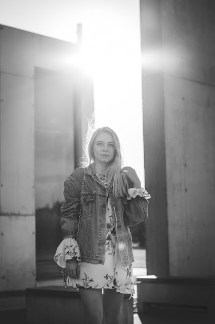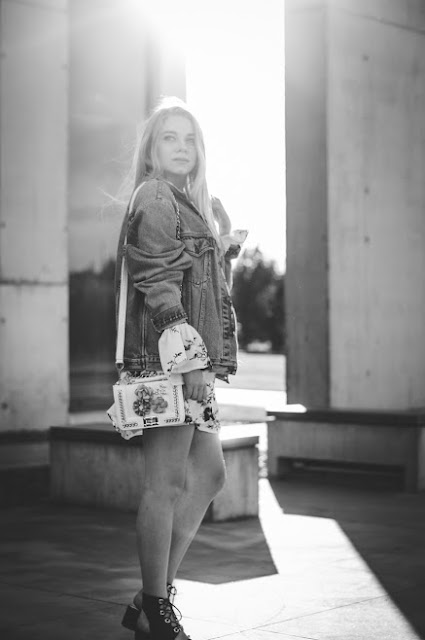 Stylizacja na letni wieczór - sznurowana sukienka w kwiaty i jeansowa kurtka oversize